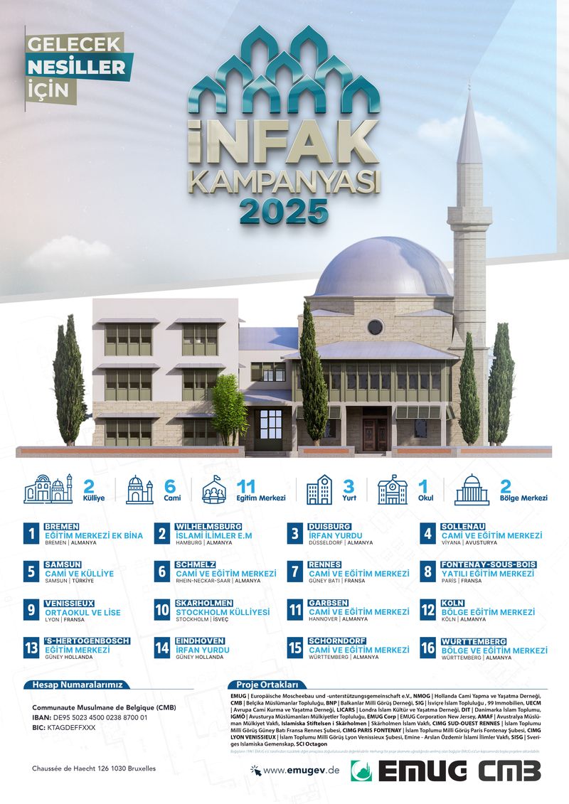 Avrupa'nın dört bir yanına umut olacak 2025 İnfak Kampanyamızı başlatmanın heyecanını ve sorumluluğunu taşıyoruz. Amacımız, çocuklarımızın kimliğini koruyacağı, gençlerimizin ilim öğreneceği ve cemaatimizin huzur bulacağı kalıcı eserler bırakmaktır.